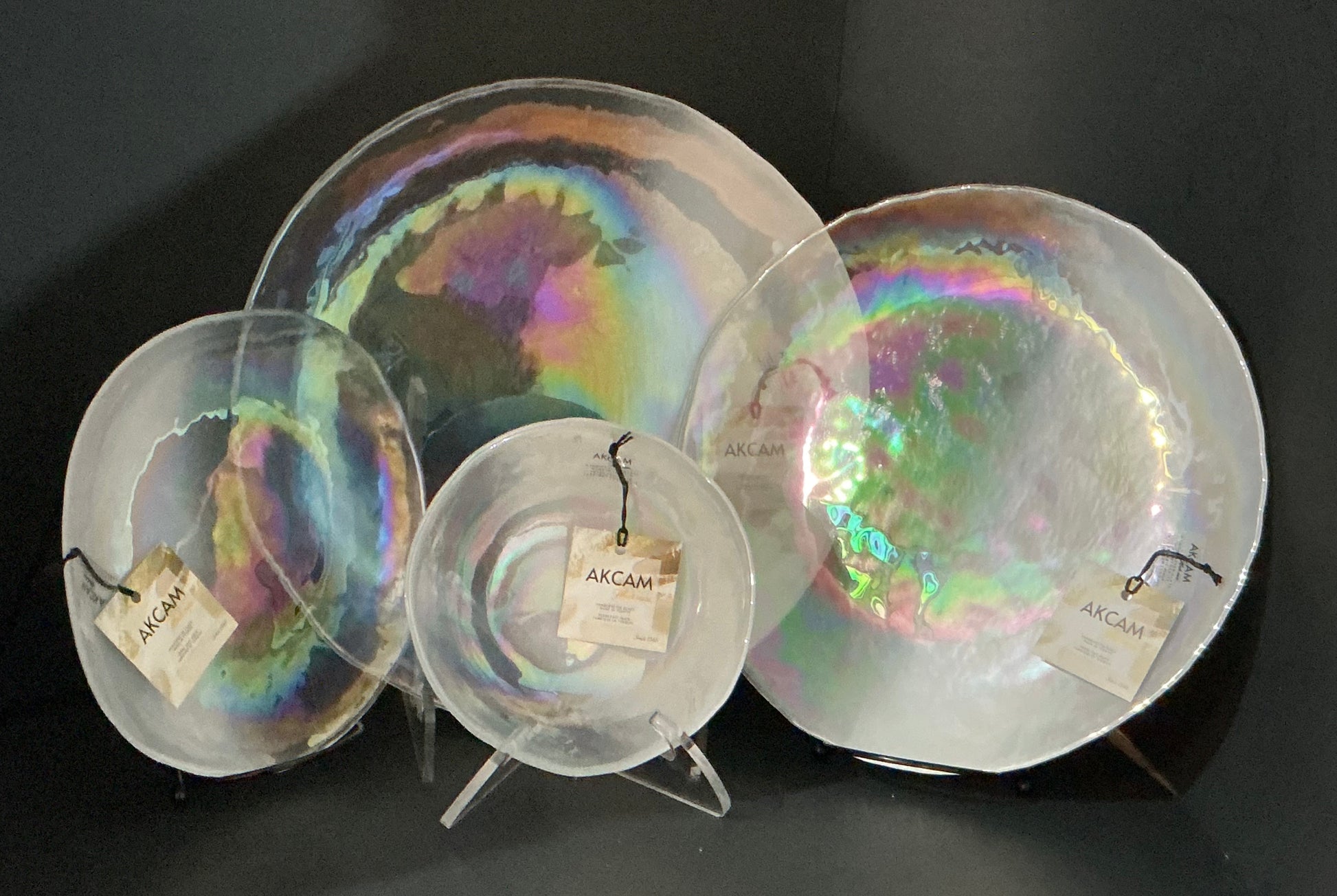 Akcam Iridescent Glass Set of 4 includes a 12” 10” 8” plates and a 6” bowl, which are handmade in Turkey known with their shimmering opal-like finish that changes color with light.