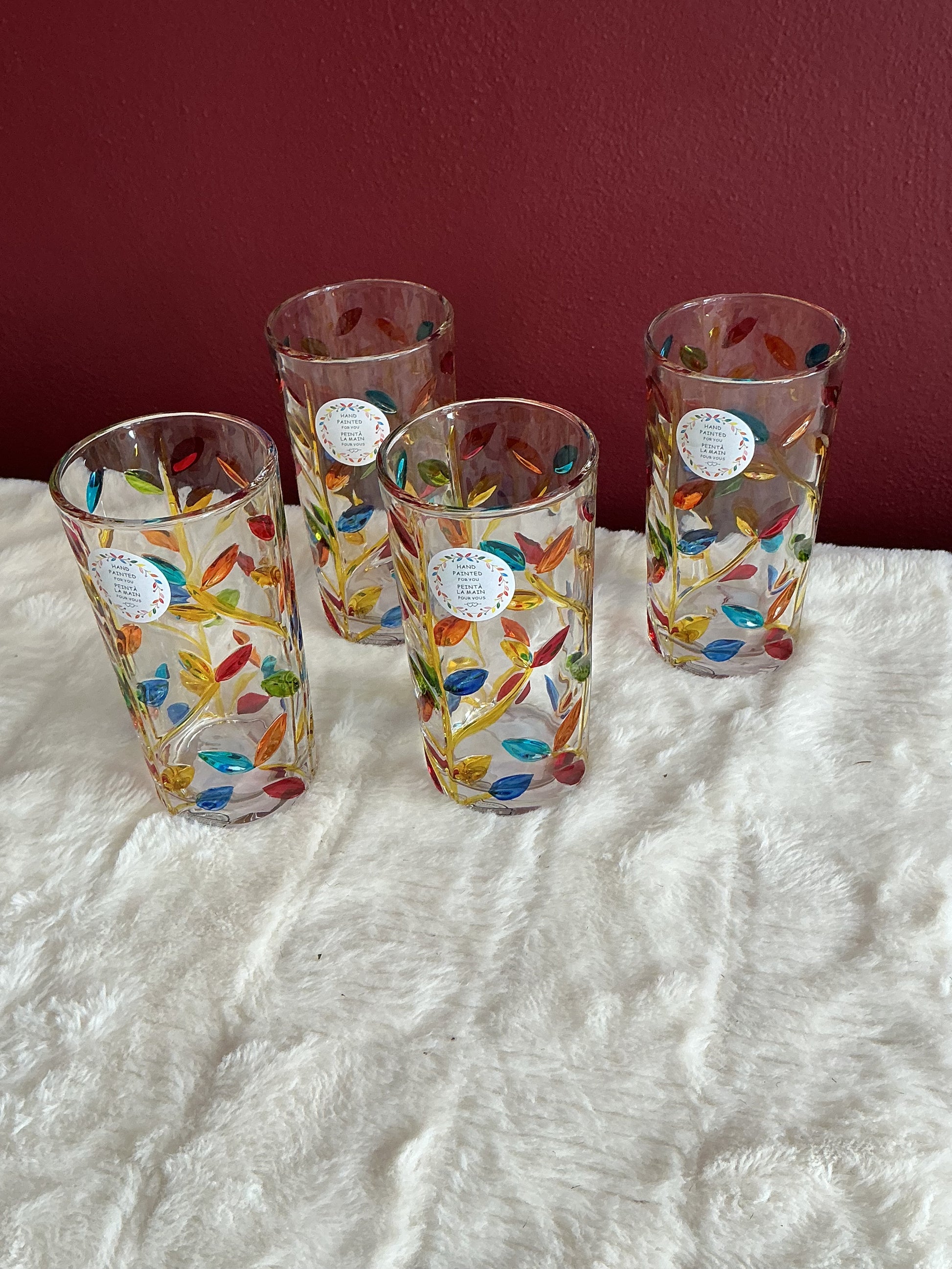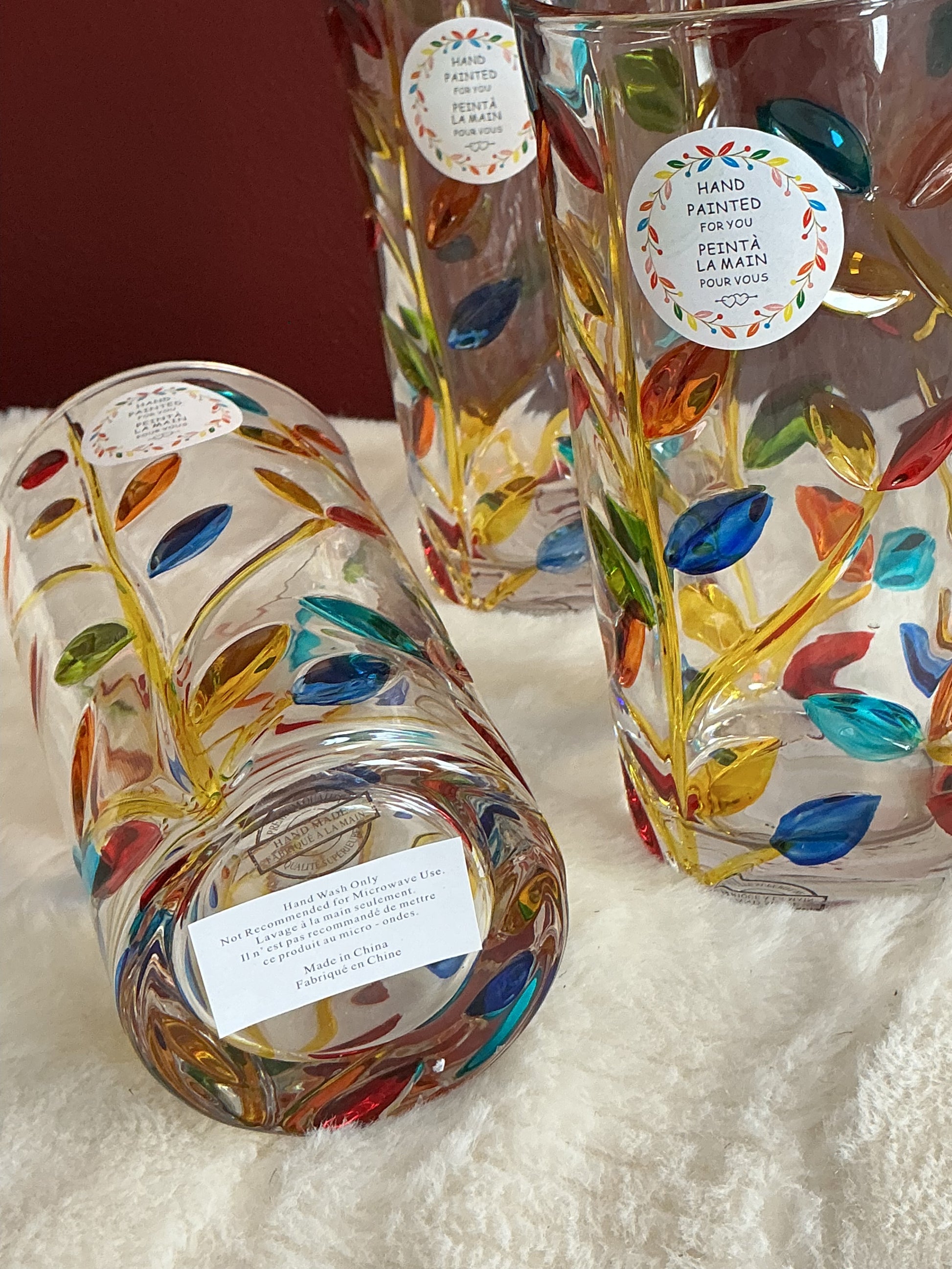 Milano Highball Glasses Set of 2 – Hand Painted Colorful Leaf Vine Design, New