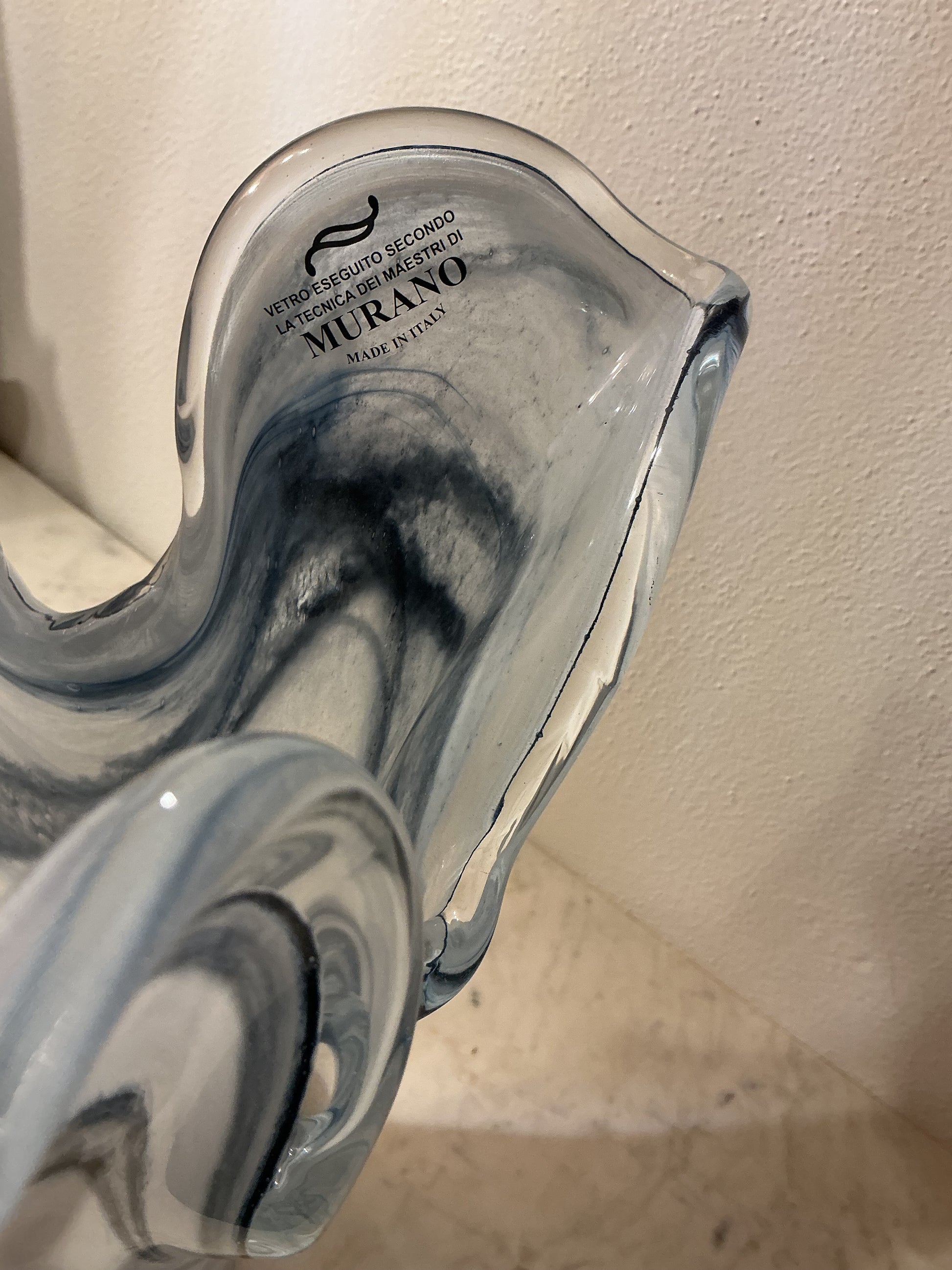 This Murano Art Glass Vase is a beautiful hand-blown piece that stands at 11.5 inches tall, with a ruffled blue color finish. Made in Italy, this vase showcases intricate abstract art patterns in the Mid-Century Modern style. The glossy finish and decorative features make it a unique and eye-catching addition to any home decor. Packaged in a box, this original piece of art glass from the Murano brand is sure to add a touch of vintage charm to any space. Made in Italy,