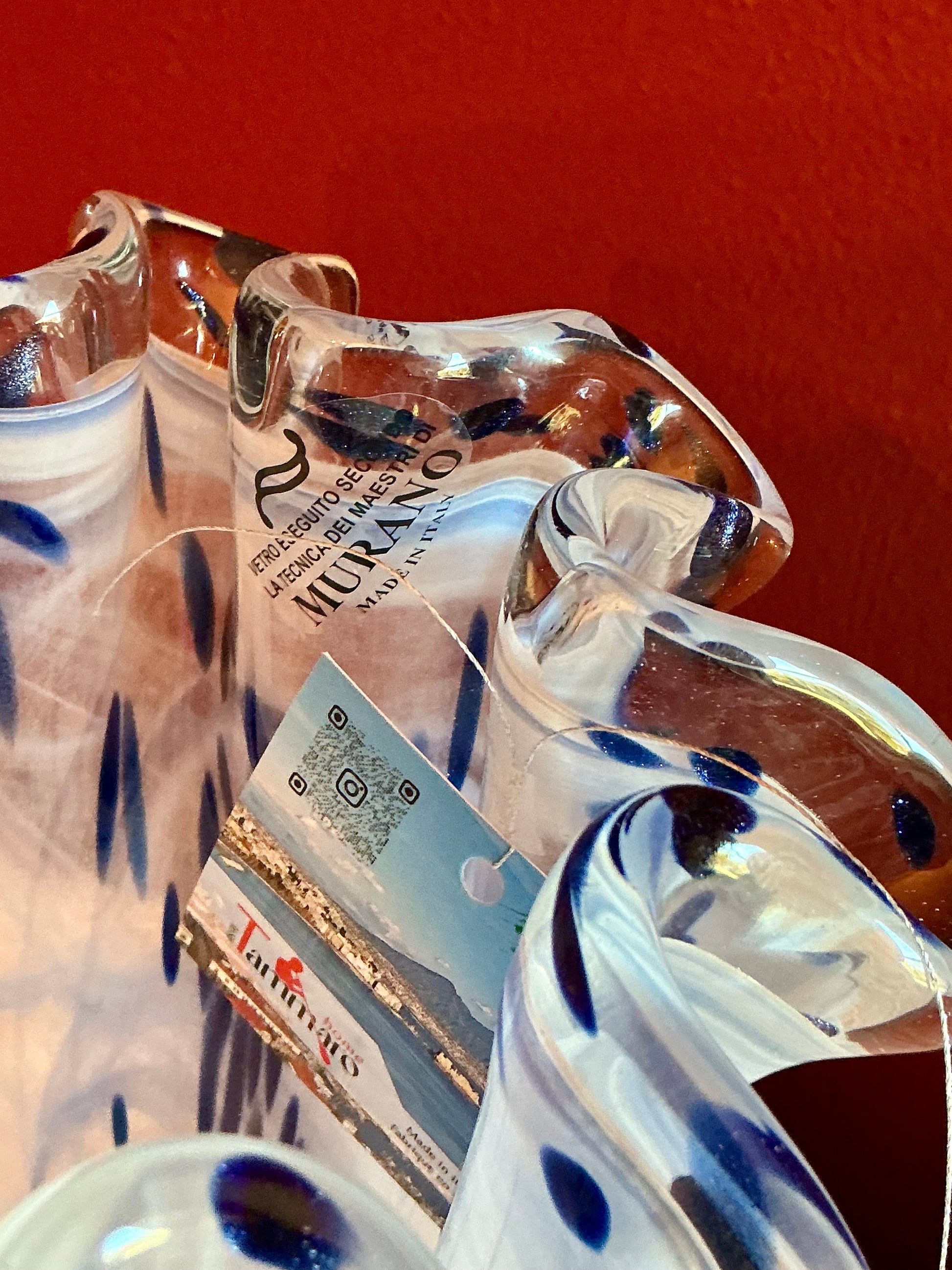 This Murano hand-blown glass vase is a beautiful addition to any home decor. Made in Italy, this 10-inch vase features a light baby blue white swirl color with a glossy finish, giving it a modern yet elegant look. The vase is handmade using the art glass production style, showcasing the skill and craftsmanship of the Murano brand. Packaged in a box, this decorative piece is perfect for adding a touch of vintage charm to any space. Mid -20th century