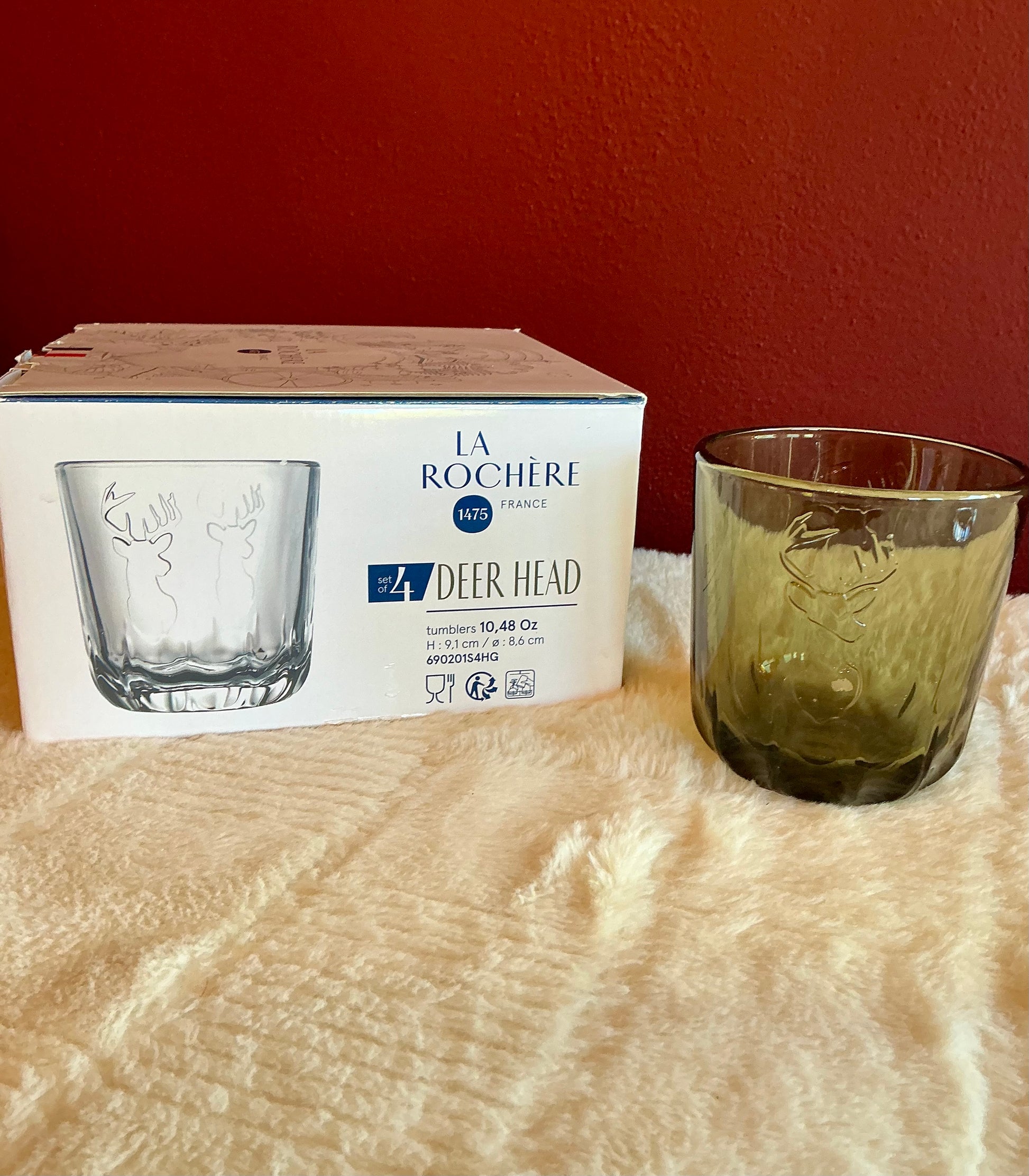 The product is a set of 2 La Rochère Deer Head Whiskey Glass Tumblers in olive green color. Each tumbler has a capacity of 10.48 oz and is made of glass, making it dishwasher safe. Perfect for all occasions, these whiskey glasses feature a unique deer head design and are ideal for enjoying your favorite spirits in style.